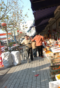 写真中:上海の町でも高度成長の影響か、自転車からスクーターへの移行が進んでいる