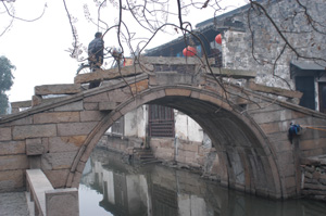 写真右:周庄の魅力の1つはこの小さな石橋。